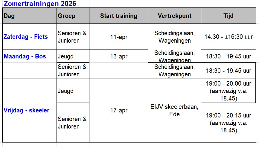 Vanaf half april starten de meeste zomertrainingen weer op (zie tabel hierboven voor de exacte startdata). Zowel de bos-, fiets- en skeelertrainingen zijn leuke en gezellige trainingen gericht op conditie, techniek en plezier. Ieder is van harte welkom om op zijn/haar eigen niveau mee te trainen. En op maandag (bos) en vrijdag (skeeler) zijn er aparte trainingen voor de jeugd.
